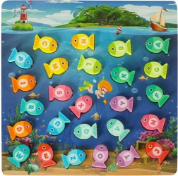 Gå ind i den magiske undervandsverden og oplev uendelig sjov med træ spillet til at fiske efter fisk. Dette pædagogiske spil hjælper børn med at lære bogstaver, farver og tal. Fiskene markeret med individuelle bogstaver skal matches til de rigtige huller, og du kan også fange dem med en magnetisk fiskestang. Hele processen hjælper med at udvikle koncentration og tålmodighed.