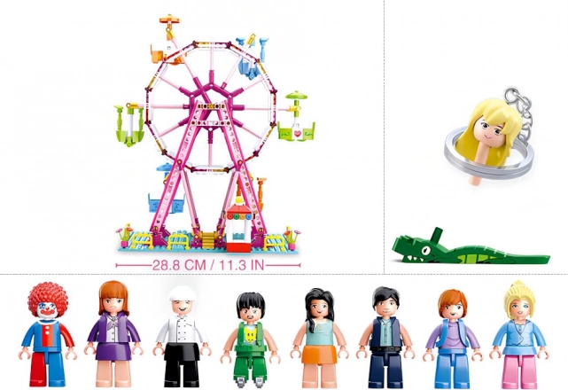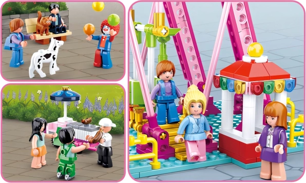 Sættets omdrejningspunkt er et stort pink-blåt Pariserhjul med funktionsdygtig rotation og flere kabiner. Børn kan nemt sætte forlystelsen i gang og skabe en realistisk tivoliatmosfære.