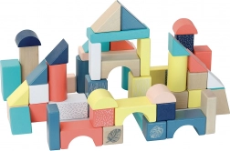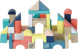 Farvede og naturlige klodser, forskellige former (bjælker, terninger, buer, cylindre, trekanter)