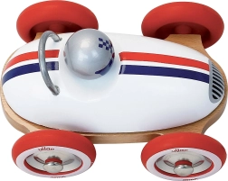 Forkæl børnene med et klassisk legetøj med tidløs charme. Træ-Roadsteren fra VILAC kombinerer kvalitetslakeret træ og metal med gummibelagte hjul, hvilket giver en stille og jævn kørsel både på gulv og tæppe. Den elegante hvide krop med blå-røde striber og den stilfulde førerfigur understreger det autentiske racerløbslook.