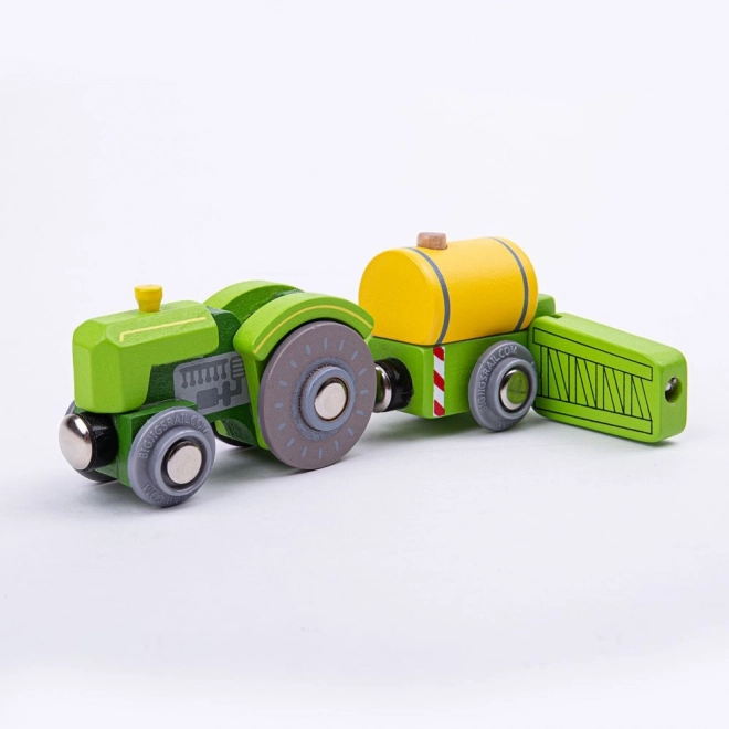 Den grønne traktor med trailer og sprøjte er et fantastisk supplement til landbrugssæt såvel som almindelige togbaner. Takket være den universelle magnetkobling forbinder den let vognene og udvider legemulighederne både på gården og på skinnerne.