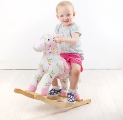 Takket være det bløde plyssæde og den stabile trækonstruktion er legen på denne gyngenhest både komfortabel og sikker.