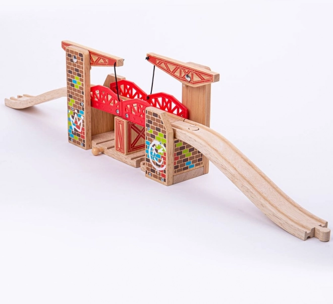 Dobbelt hævebro fra Bigjigs Rail giver dig mulighed for nemt at løfte begge sider og dermed give plads til samtidige togpassager. Denne bro er kompatibel med de fleste andre mærker af træjernbaner.