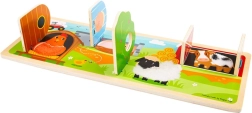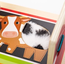 Det sensoriske puslespil med gårdtema giver børn en rig verden af former, farver og teksturer. Åbne låger og taktile elementer inviterer til at udforske, stille spørgsmål og fortælle historier. Børn øver på legende vis genkendelse af dyr, visuel opfattelse og taktil kunnen.