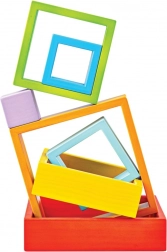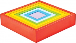 Regnbuepaletten og de gradvist mindre firkanter hjælper børn med at skelne farver, størrelser og former. Ideelt til den første sortering og navngivning.