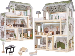 Trædukkehuset LULILO Floro er designet i boho-stil, hvilket gør det ikke bare smukt, men også funktionelt. Med sine tre etager og den rummelige terrasse tilbyder det masser af plads til forskellige scenarier og lege. Huset er udstyret med fire rum: køkken, badeværelse, stue og soveværelse, hvor hvert rum er rigt udstyret som i et rigtigt hjem.