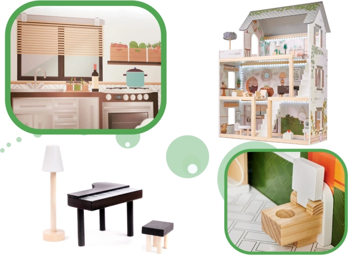 Dukkehuset LULILO FLORO i blid boho-stil kombinerer naturligt udtryk, elegante detaljer og funktionelle elementer til små historiefortællere. Børn vil elske de fire indrettede rum – køkken, badeværelse, stue og soveværelse – samt den rummelige terrasse med liggestol og parasol. Integreret LED-belysning understreger stemningen i legen både dag og aften.