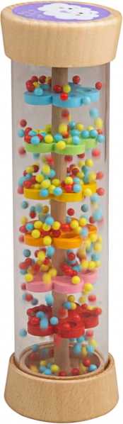 Bigjigs Baby regnlydsrør er et sanselegetøj, der fanger børn med sin beroligende susen og klare farver. Inde i det gennemsigtige rør ruller kuglerne hen over farvede skiver og efterligner blid regn. Begge ender er dekoreret med søde motiver af sol og sky, som stimulerer den visuelle sans.