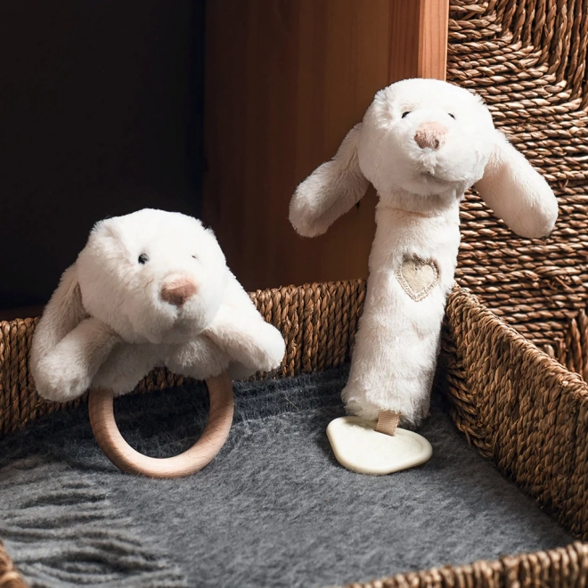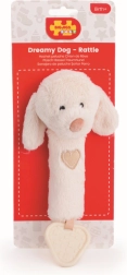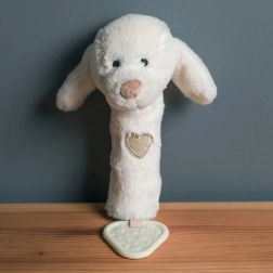 Denne alsidige, bløde legetøjs-hund giver barnet tre oplevelser i ét: blid raslen til at stimulere hørelsen, sjov pivelyd ved tryk og et tekstureret bidelegetøj for lindring ved tandfrembrud. Den neutrale, naturlige tone passer i enhver babyudstyrssamling.