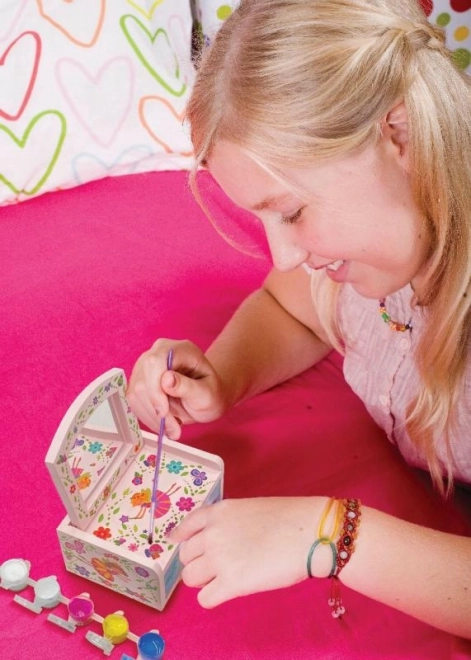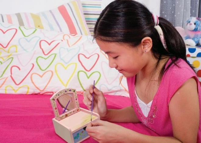 Oplev glæden ved at skabe med dette fantastiske kosmetiske smykkeskrin. Dette sæt giver dig mulighed for at male og dekorere dit eget skrin til små skatte, ideelt til kreative børn.