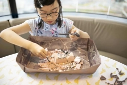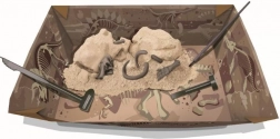 Oplev ægte udgravninger. Gipsblokken gemmer på enkelte dele af skelettet, som børnene afslører ved hjælp af de medfølgende værktøjer.
