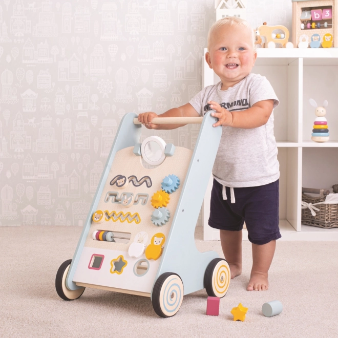 Træ-aktivitetswalker til børn med legende elementer, støtter motoriske færdigheder, fremstillet af FSC-certificeret træ.
