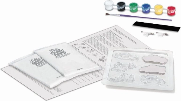 Dette sæt giver børn mulighed for at udtrykke deres kreativitet og lave deres egne racerbiler ved hjælp af gips og farver.