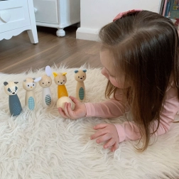 Kast og opsætning af keglerne udvikler finmotorik, hånd-øje-koordination og tålmodighed. Perfekt til at øve den første optælling af væltede kegler.