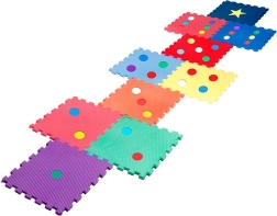 Livlige farver og former (prikker, stjerne) stimulerer sanserne og udviklingen af fin- og grovmotorik. Skummet dæmper stød og beskytter mod gulvkulde.