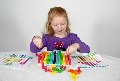 Denne farverige motoriske mosaik er et ideelt hjælpemiddel til at udvikle finmotorik og logik hos børn fra 3 år. Børn sætter knopper i hullerne efter skabeloner eller deres egen fantasi, hvilket træner tålmodighed, koncentration og præcision.