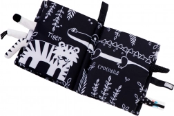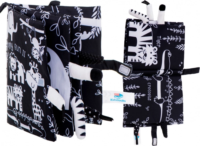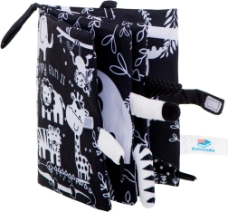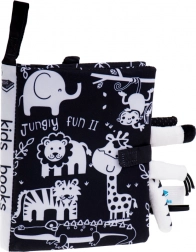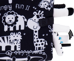 Den første bog til baby, der stimulerer sanserne og fantasien. En let tekstilbog i sort-hvidt kontrastdesign med safarimotiver og udstående dyrehaler, som støtter visuel stimulering, finmotorik og øje-hånd-koordination. Raslende sider, forskellige teksturer og engelske dyrenavne fanger interessen allerede fra fødslen.