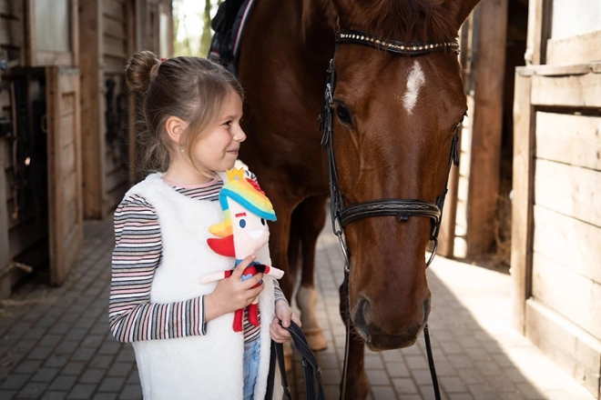 Med regnbuefarvede accessories og et venligt smil giver den børn en følelse af glæde og tryghed.