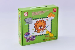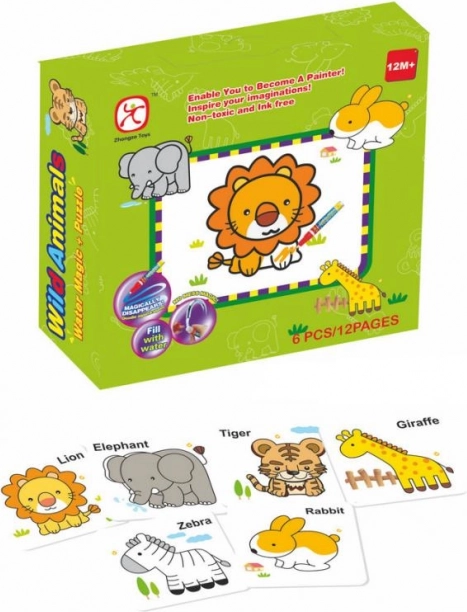 Indsætningspuslespil Dyr og vandmaling er den ideelle kombination til udvikling af fantasi og finmotorik. Børn kan glæde sig over seks forskellige billeder – kanin, elefant, giraf, løve, zebra og tiger.