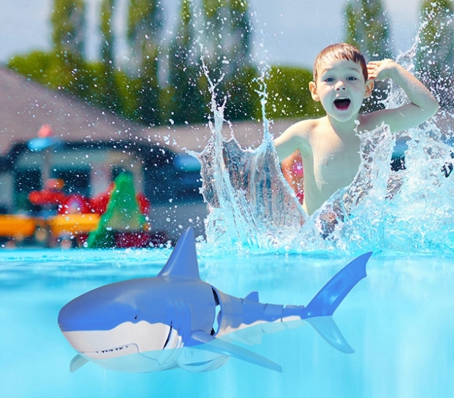 Med den sorte fjernbetjening med blå knapper kan du nemt kontrollere hajen og dens bevægelser.