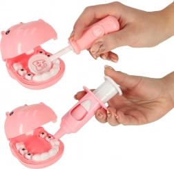 Et sjovt og lærerigt dentalt sæt med en lille flodhest hjælper børn med at overvinde tandlægeskræk og lære god mundhygiejne. Indeholder alt, hvad en lille tandlæge har brug for: flodhest med aftagelige tænder, tandbørste og tandpasta, dentalt spejl, sprøjte, “boremaskine”, pincet, scaler og læringskort.