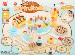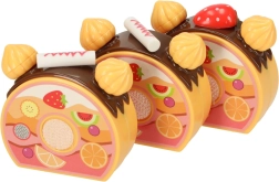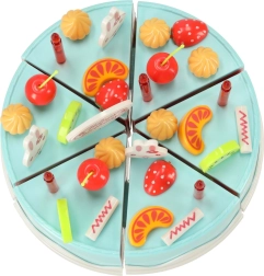 Seks kagestykker er forbundet med burrebånd – børnene skærer dem let med plastkniven og samler dem igen. Ideelt til træning af finmotorik og realistisk leg.