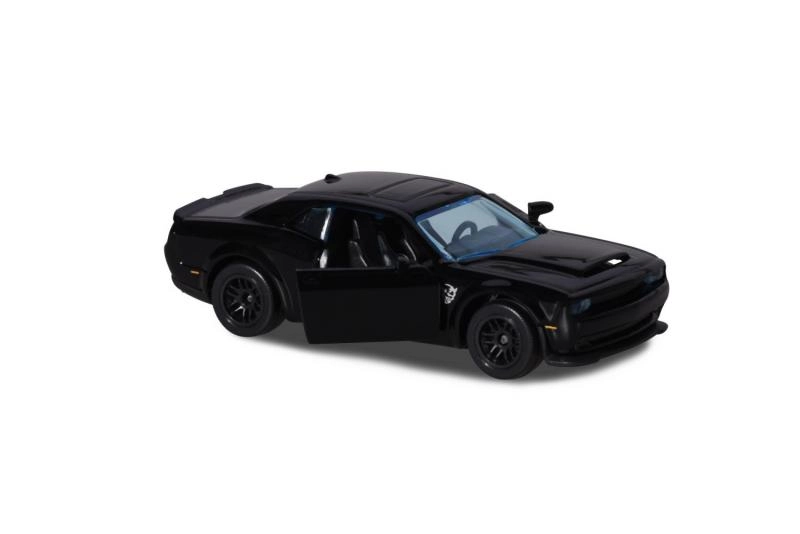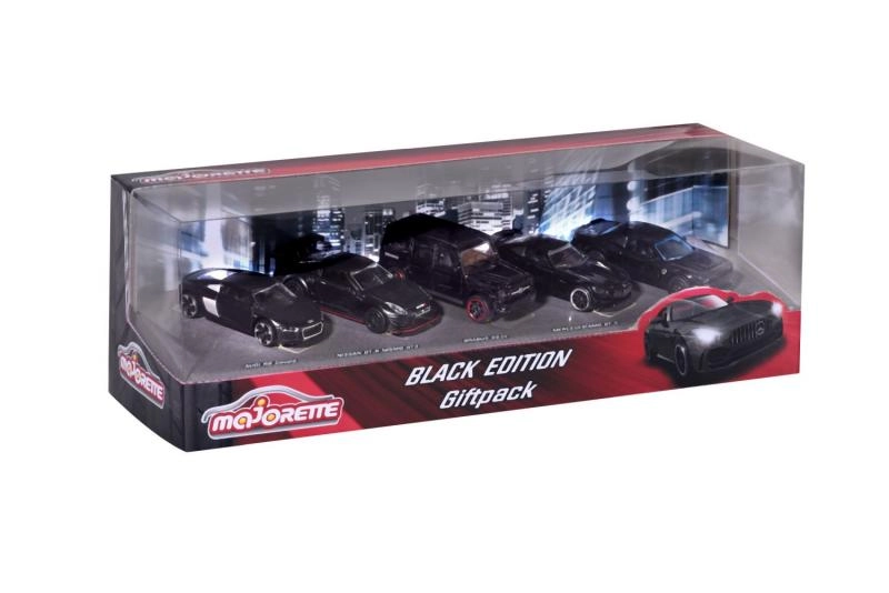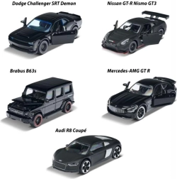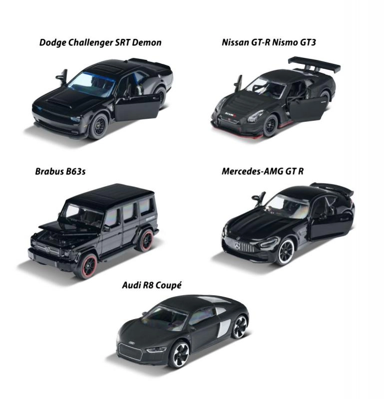 Opdag samlersættet Majorette Black Edition med fem metalbilmodeller i skala 1:64. Kollektionen i elegant sort udførelse inkluderer ikoniske biler som AUDI R8, BRABUS B63, NISSAN GT3 NISMO GTR, DODGE DEMON og Mercedes-AMG GTR. Nogle modeller har åbnelige dele, og alle imponerer med detaljeret udførelse og frihjul – perfekt til leg og udstilling.