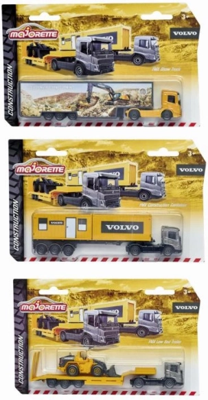 Licenseret metalmodel Volvo transporter tilbyder 3 varianter: med trailer og hjullæsser, med 2 byggecontainere eller som lastbil med aftagelig trailer. Takket være det robuste metalchassis og den højkvalitets udførelse tåler den intensiv leg. Længde 20 cm.