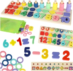 Denne montessori-sæt forener byggeglæde med læring. Børn placerer trægeometriske former og tal i de rigtige huller og trækker samtidig farvede ringe på pinde, hvor antallet svarer til det pågældende tal. Med den overskuelige træbase bliver læring naturlig og sjov.