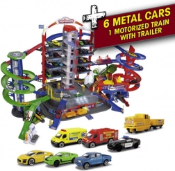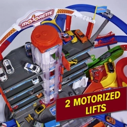 Den store legegarage med en bredde på næsten 1,30 m er den største nye nyhed i Majorette-verdenen! Garagen består af syv legeområder og har op til 35 parkerings- og opbevaringspladser. Stationens hjerte er en motoriseret, spiralformet elevator, der samtidig kan bære op til ni metalbiler. Når de er øverst, fordeler automatiske skiftere bilerne til fire forskellige baner. Seks forskellige lys- og lydeffekter samt utallige legezoner som togstation, tankstation med benzindispenser, autoværksted og bilvask, brandstation, politistation med hemmeligt skjulested eller helipad giver uendelig underholdning. Inkluderet er 6 metalbiler, et batteridrevet tog, automatiske sporskifter, en tunnel med crasheffekt og 2 motoriserede elevatorer. Helikopter er ikke inkluderet. Mål efter samling: 128 x 78 x 73 cm.