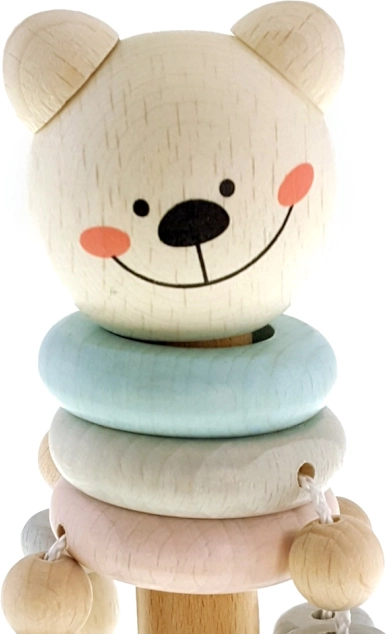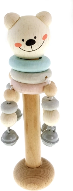 Det søde træ-rangle formet som en bjørn med blidt klingende klokker vil glæde enhver baby. Legetøjet imponerer med pastelfarver, støtter finmotorikken og er lavet af certificeret træ med miljøvenlige og holdbare farver. 100% fremstillet i Tyskland.
