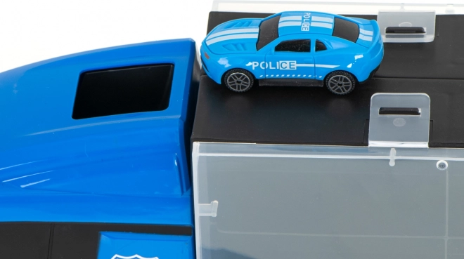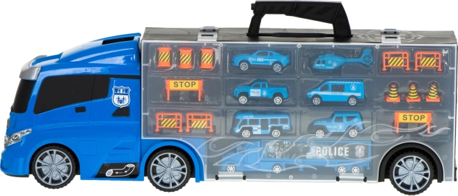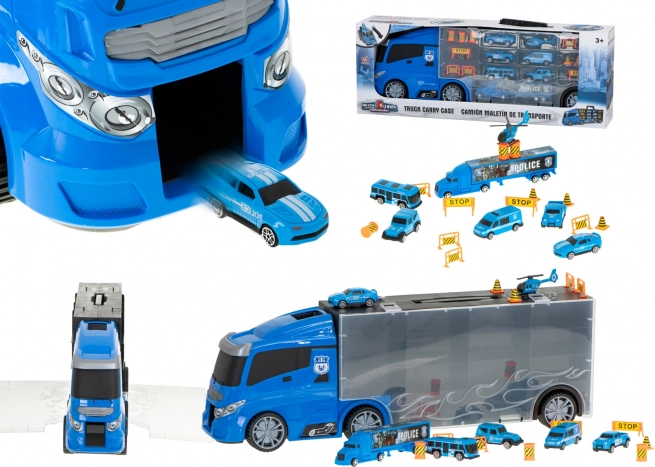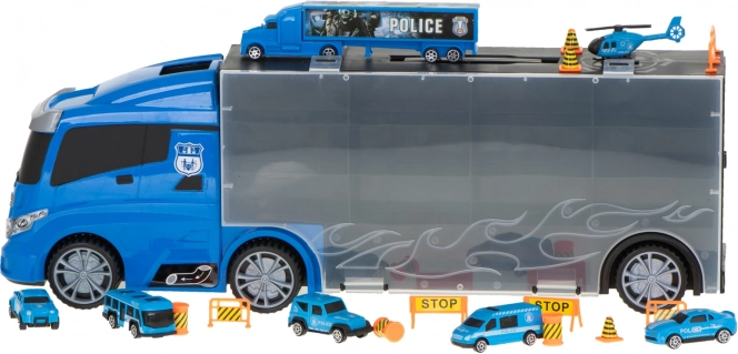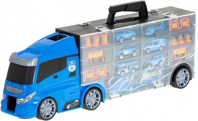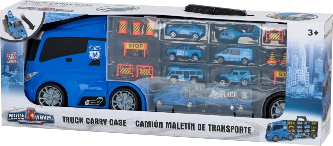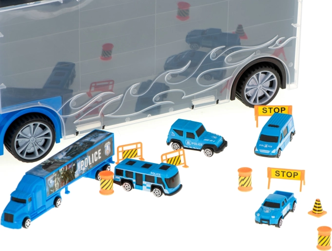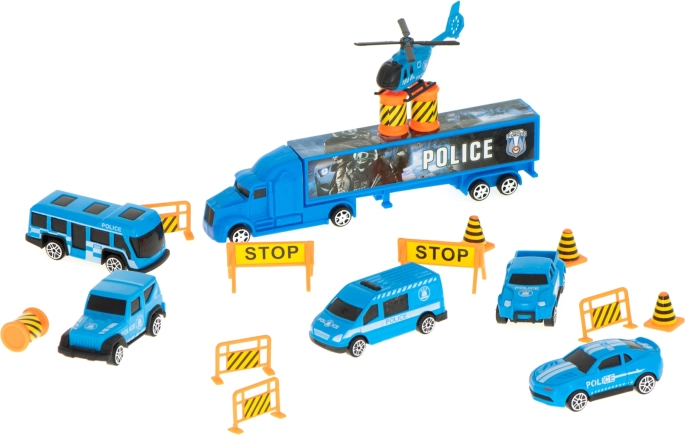 Sættet indeholder 6 detaljerede metalpolitivogne og en helikopter, suppleret med trafikelementer til spændende scener. Transportøren rummer op til 26 småbiler, så der er masser af plads til flere samlerstykker.