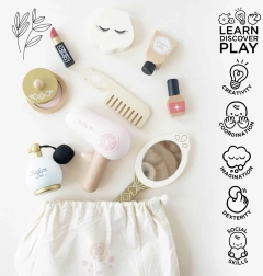 Denne smukke sæt fra Honeybake-kollektionen af LE TOY VAN giver børn en autentisk oplevelse af makeup og hårstyling. Den tekstile taske i naturlig bomuld rummer trætilbehør med afrundede kanter, lakeret med giftfrie vandbaserede farver. Ideel til små makeupartister, der vil skabe trygt og fantasifuldt.