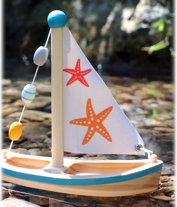 Stilfuld træsejlbåd med søstjernemotiv er klar til vandeventyr i badekarret, ved poolen og ved havet. Den har et flydende skrog, dekoration med træperler og rigelig plads til egne figurer. Et miljøvenligt alternativ til plastiklegetøj, egnet fra 24 måneder. Mål 17 × 8,5 × 20 cm.