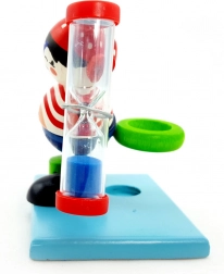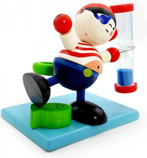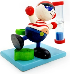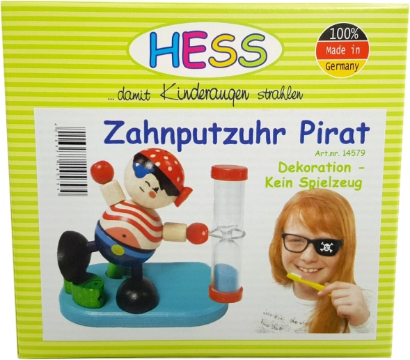 Motivér børn til regelmæssig tandbørstning på en sjov måde. Den træskårne pirat med timeglas og blå sand måler pålideligt de anbefalede 2 minutter, mens den integrerede holder til tandbørste holder badeværelset ryddeligt.