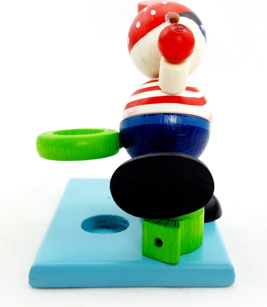 Produktet er 100% fremstillet i Tyskland af omhyggeligt udvalgte, originale ubehandlede træsorter. Takket være den kompakte størrelse på 9 cm passer den både på håndvasken og på hylden og underholder samt motiverer børn med sit glade design.