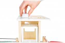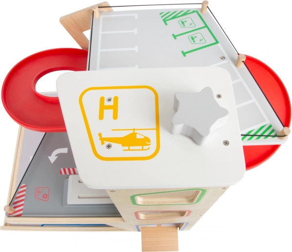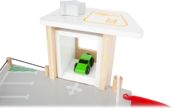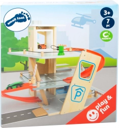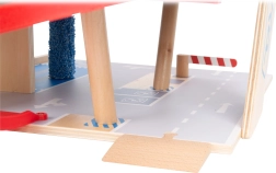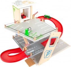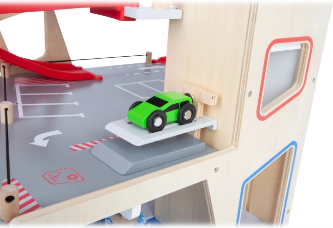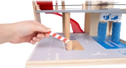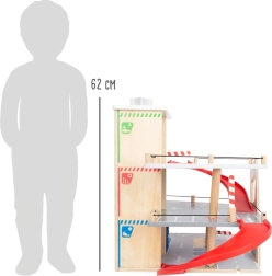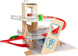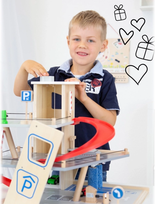 Dette premium parkeringshus i kvalitets krydsfiner tilbyder tre rigt udstyrede niveauer forbundet med en funktionel elevator og to glidende ramper. Børn kan parkere, tanke, lade, vaske og reparere – alt på ét sted, med realistiske elementer og fantastisk legeværdi.