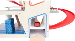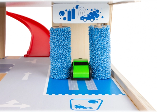 Vaskehallen med roterende børster giver legen realisme, mens gummiafskærmningen på etagerne forhindrer, at bilerne falder ud og øger sikkerheden under kørslen.