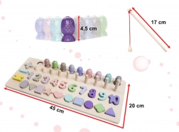 På den solide træbase venter udskæringer til tal og former, ti pinde til at stable farvede ringe samt et lille fiskespil med træfisk og magnetisk fiskestang. Hver pind svarer til et bestemt tal – barnet forstår naturligt forholdet mellem tal og mængde.