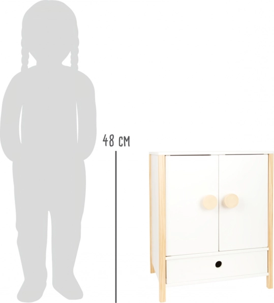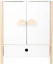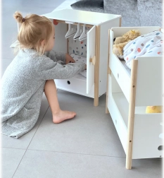 Den robuste trækonstruktion, stabile forarbejdning og sikre, afrundede kanter giver en behagelig og tryg legeoplevelse. Skabet fremmer selvstændighed, sans for orden og udvikler fantasien gennem rolleleg med dukkepasning.