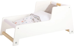 Der medfølger vendbart, neutralt sengetøj og en stor dyne, under hvilken dukker eller bamser op til 46 cm passer komfortabelt. De blide farver og minimalistiske linjer gør den til et stilfuldt indslag i enhver indretning og understøtter kreativ og imitativ leg.