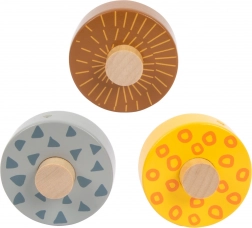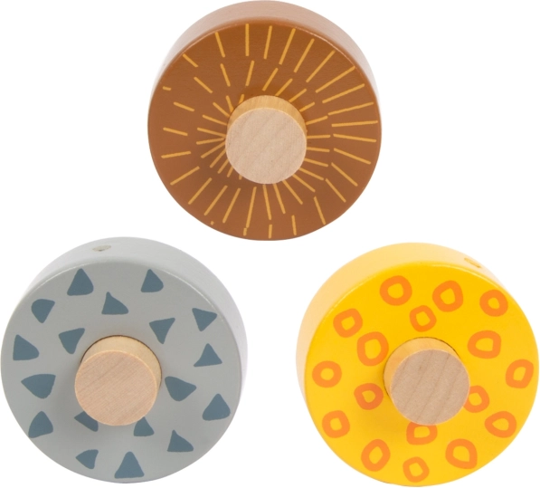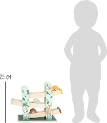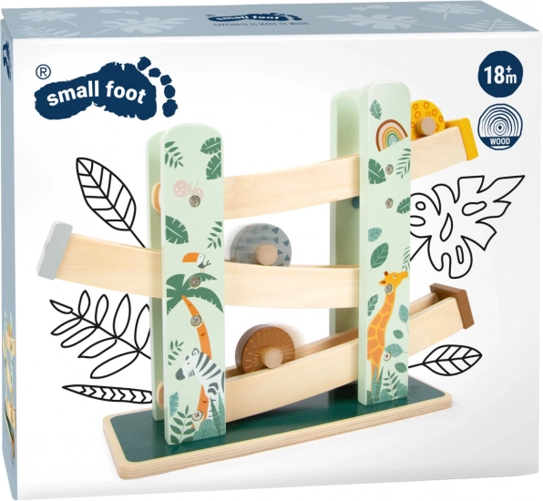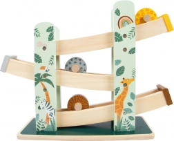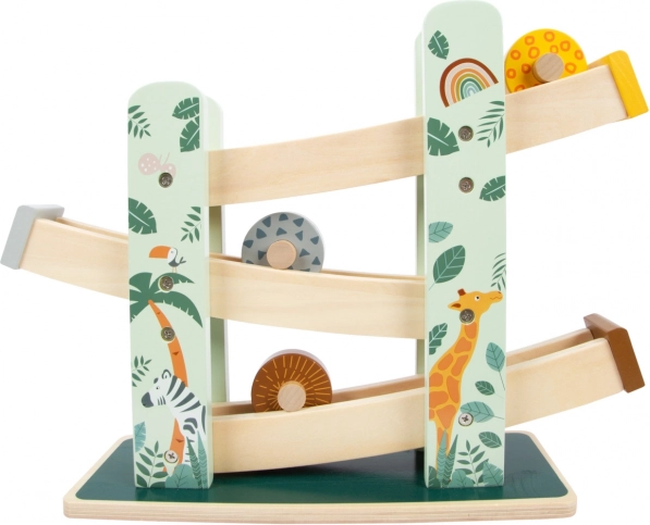 Denne smukke træbane giver børn mulighed for at se på, hvordan tre hjul, hver med et unikt design, ruller ned ad tre ramper. Den er dekoreret med illustrationer af safari- og junglelevende dyr og planter.