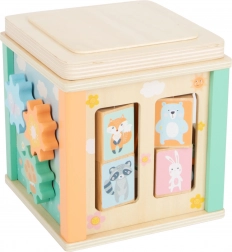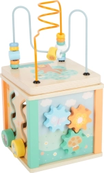 Puttekasse, tandhjul og drejbare billeder understøtter finmotorik, logisk tænkning samt genkendelse af farver og former.