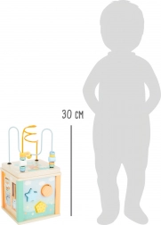Det praktiske låg med perlelaborint kan tages af og opbevares vendt på hovedet inde i terningen, så legetøjet ikke optager unødvendig plads. Ideel til børn fra 12 måneder som et sikkert og stimulerende redskab til de første opdagelser af verden.