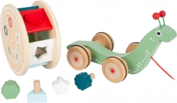 Vi præsenterer en sød træksnegl på snor, der ikke kun underholder, men også hjælper med udviklingen af dit barn. Takket være dens lethed og let drejende hjul er den ideel til børn, der begynder at gå, og den støtter deres koordination og balance. Sneglen fungerer også som sorter med fem forskellige former, som stimulerer kognitive evner og finmotorik.