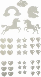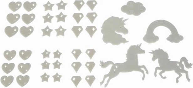 Skab en magisk atmosfære på ingen tid. Sættet af fluorescerende dekorationer med enhjørningemotiv gløder blidt i mørket efter belysning og forvandler ethvert børneværelse til et eventyrrige. Delene fastgøres nemt med klæbegummi, som medfølger i pakken.