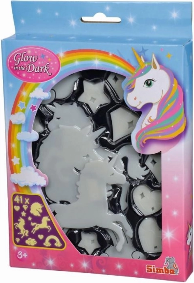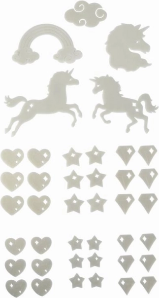 Oplys børneværelset med et sæt selvlysende dekorationer til mørke med motiv af en enhjørning og andre billeder. Efter kort opladning i lys lyser de i mørke og fastgøres nemt på væg, loft og møbler. Pakken indeholder 41 stk. og klæbegummi for nem montering.