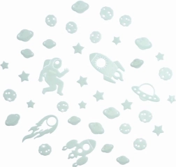 I pakken finder du et bredt udvalg af former – fra stjerner og planeter til raket og astronaut. Takket være klæbegummi er dekorationerne klar til øjeblikkelig montering uden boring og besværlige ændringer; du kan nemt placere dem på vægge, loft og glatte møbler.