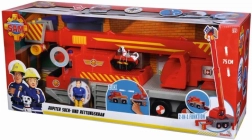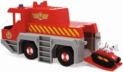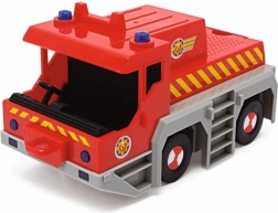 Ryk ud med brandbil med kran 2‑i‑1 BRANDMAND SAM. Det robuste plastkøretøj måler 50 cm i længden, og takket være den aftagelige frontdel giver det to lege i én – kørsel med kabinen og arbejde med kranen.