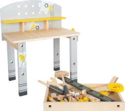 Arbejdsbænken indeholder sav, klemme, skruetrækkere og andre værktøjer, som giver børnene mulighed for at efterligne rigtige byggeprojekter.